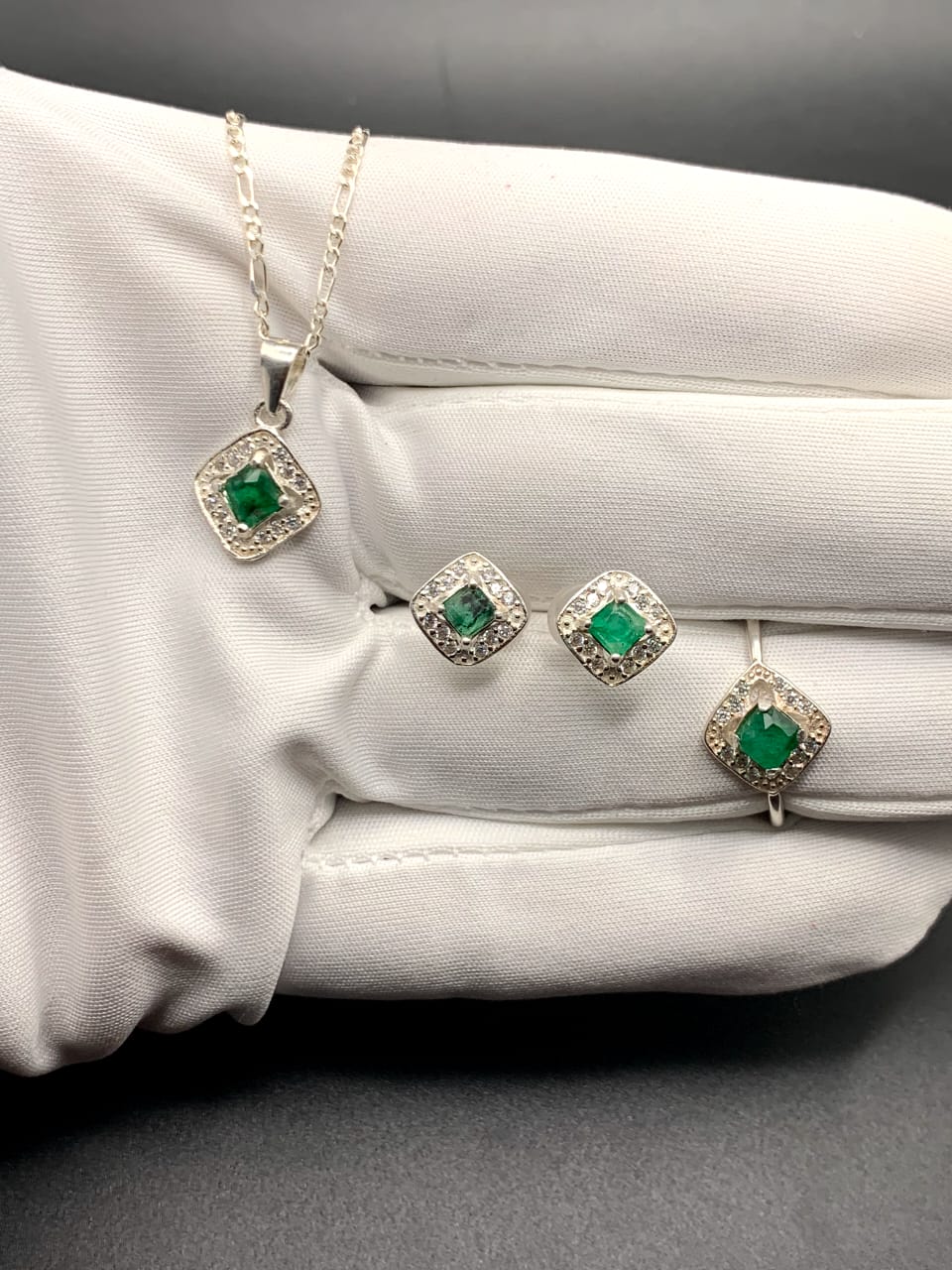 Experience timeless sophistication with this Swat Emerald Set by Fidaa, expertly crafted in Italian silver. Each piece is centered with a radiant square-cut Swat Emerald, framed by a delicate halo of sparkling stones that enhance its natural brilliance and depth.